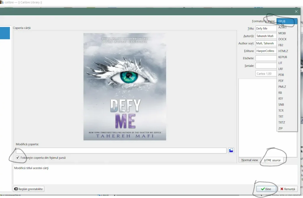 După ce ai apăsat pe convertire, îți va apărea automat cartea PDF pe care ai adaugat-o în program, după exemplul de mai jos. Tot ce trebuie să faci este să apeși pe folosește coperta din fișierul sursă, apoi pe HTML source și să alegi formatul de care ai nevoie. Eu am ales EPUB pentru că am Kindle Basic, Generația 11, 2024 și acesta este formatul pe care Amazon îl acceptă pentru model. Dacă ai un alt model vechi/nou, află ce format este potrivit și dacă poate fi acceptat de Amazon, voi detalia la final ce preupune asta.