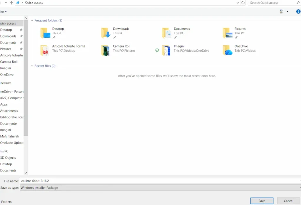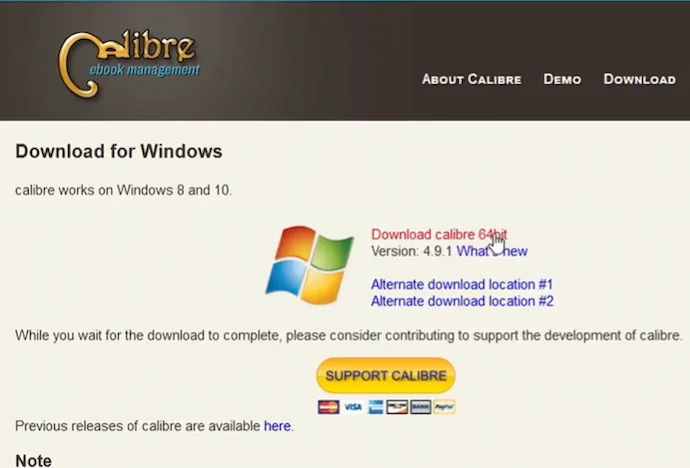 Dacă vrei să descarci programul pe Windows, după ce ai dat click pe Windows, va apărea textul Download calibre 64bit, apasă pe el și apoi salvează-l pe calculator, după modelul din imagine ca Windows Installer Package.