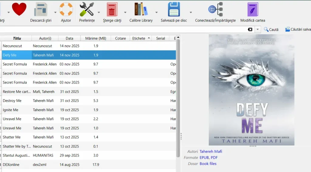 Pentru a converti o carte PDF într-un format Kindle, trebuie să intri în programul Calibre și să apeși pe Adaugă cărți. Mie îmi apare în stânga și coperta Defy Me pentru că eu o am deja descărcată, dar ție nu îți va apărea decât după ce adaugi cartea PDF. Astfel, îți voi arăta cum să adaugi cartea de la zero în program și să salvezi cu coperta originală.
